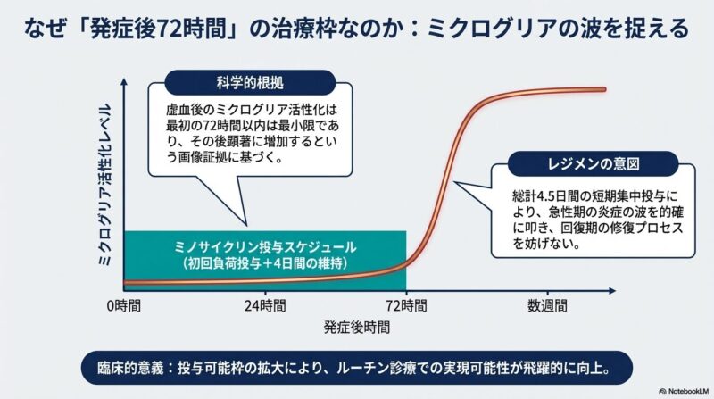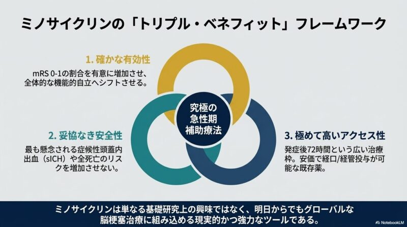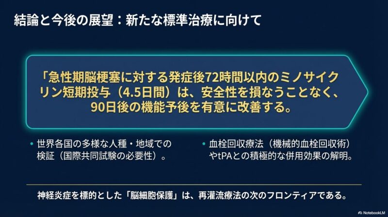 結論として、ミノサイクリンは虚血性脳卒中後の神経保護に寄与し、身体機能の回復を促進する、安全でアクセスの容易な治療オプションであることが実証されました。この知見は、安価な既存の抗菌薬を脳保護薬として再利用する新たな戦略を支持するものであり、今後の脳卒中管理における重要な選択肢となるかもしれません。