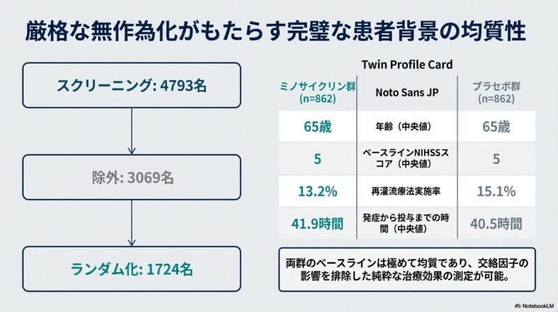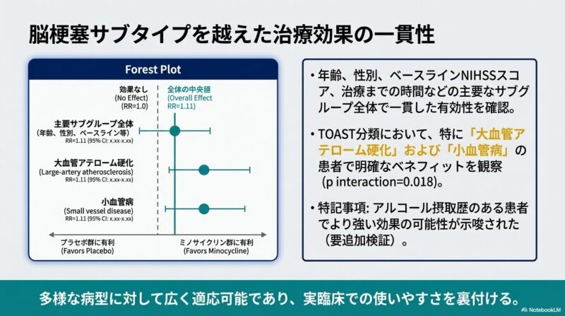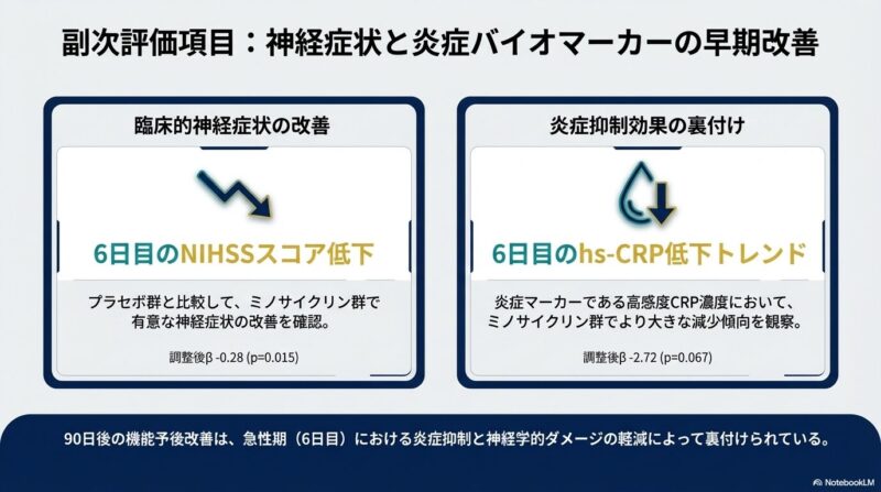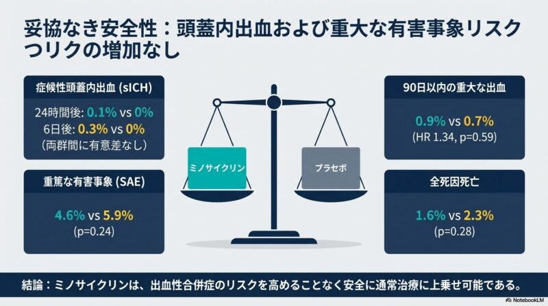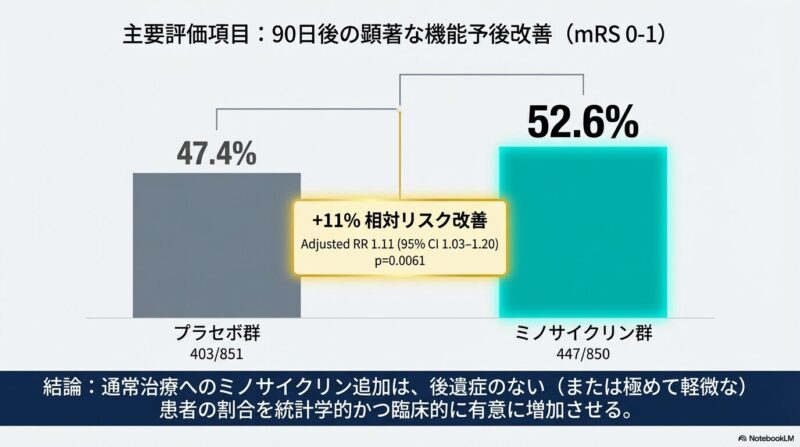 試験では、発症から72時間以内、NIHSSスコア4〜25の患者1,724名を対象に、標準治療に加えてミノサイクリン(初回200mg、以後100mgを12時間ごとに4.5日間投与)またはプラセボを投与しました。主要評価項目である90日後の優れた機能的転帰(mRSスコア0-1)52.6%、プラセボ群で47.4%となり、ミノサイクリン群で有意に良好な結果が得られました(調整リスク比1.11)。また、mRSスコア全体の分布を評価した分析や、投与6日目時点でのNIHSSスコアの改善においても、ミノサイクリン群の優越性が示されました。