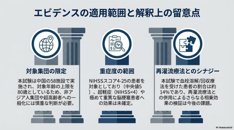 安全性についても、症候性頭蓋内出血や重篤な有害事象の発生率は両群で同程度であり、急性期における短期投与の安全性と忍容性が確認されました。