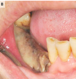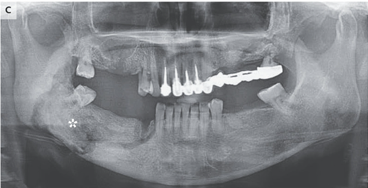 この患者は骨転移に関連する合併症を予防するために4週ごとに120mgのデノスマブ(プラリア🄬)(骨粗鬆症量としては60mgを半年ごと)の投与を受けていた。ここ半年で口腔内環境不良により歯周炎が生じ、歯は抜け落ち、無歯領域が出現してきていたことが分かった。