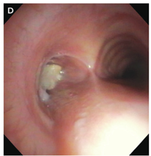 治療として気管支鏡による除去が施行され、ホルミウムレーザーと鉗子を用いて気管支結石を破砕し除去された。