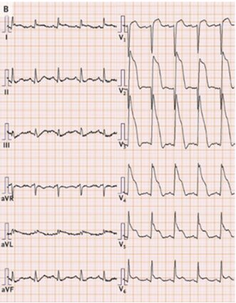Wellens症候群は特にV2-3にて閉塞された左前下行枝の自発的な再灌流後に発生する痛みの無い期間に診られるT波異常が特徴的。不安定なプラークによる冠動脈狭窄の再発のリスクを考慮すると、緊急のCAGの適応となる疾患である。