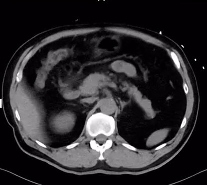 55歳男性。腹痛のため救急車で来院。腹痛精査のためCT撮影。CTから帰ってくると左上肢が動かしにくいと言っている。
