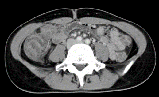 27歳女性。下腹部全体の痛みと頻回の下痢を主訴に来院。妊娠なし。造影CT施行。