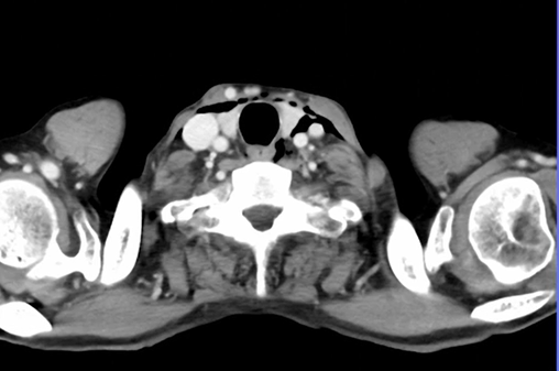 前頚部に気腫、食道周囲に気腫、わずかに気胸も見られる。左胸水も見られる。