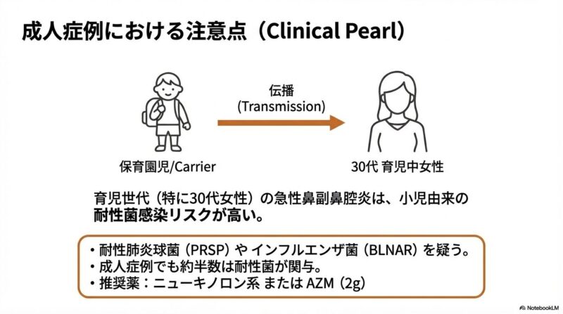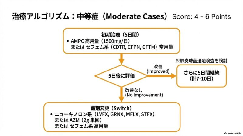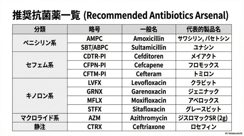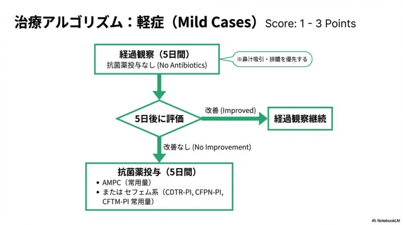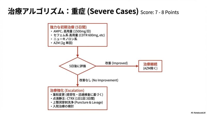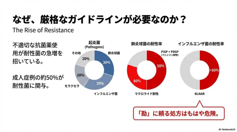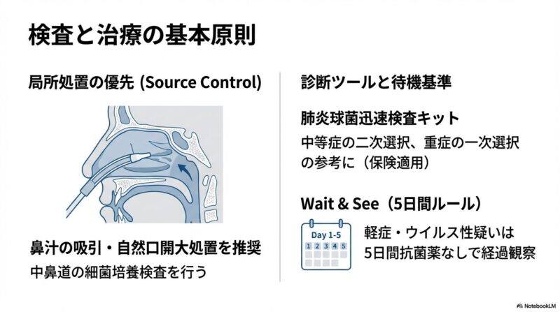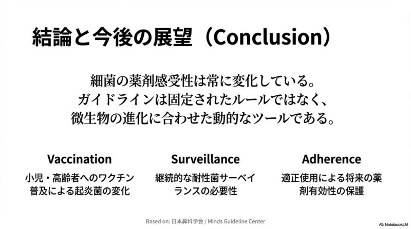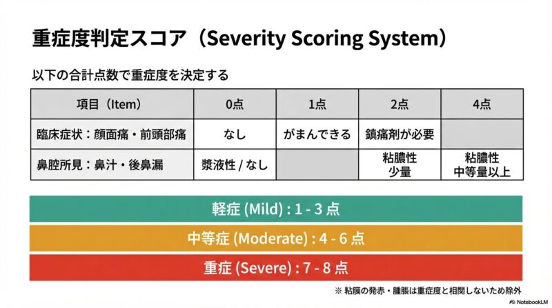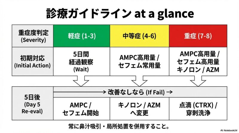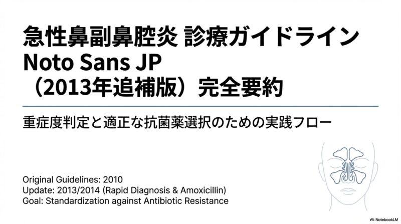 近年増加している薬剤耐性菌に対応するため、日本で策定された急性鼻副鼻腔炎の診療指針の解説です。主な内容は、患者の鼻腔の状態や痛みなどの症状をスコアリングによって数値化し、病状を軽症・中等症・重症の三段階で客観的に判定する手法を提示しています。治療の基本方針として、ウイルス性の可能性が高い軽症例には安易に抗菌薬を使わず、必要時にはペニシリン系のアモキシシリンを第一選択薬とするなどの、重症度に応じた具体的な治療アルゴリズムが確立されています。このガイドラインの目的は、適切な診断と鼻処置の優先、そして効果的な抗菌薬の選択を通じて、病気の難治化や慢性化を防ぐ適切な標準治療を普及させることにあります。