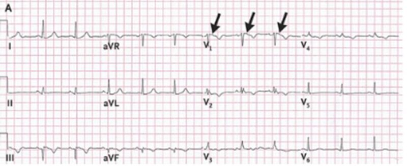 イベント後の心電図は下記通り、不完全右脚ブロック、V1~4のT波陰転化、V1におけるイプシロン波が認められた。