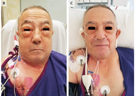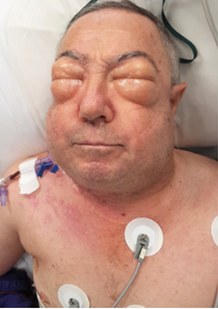 ICU入出時は目が開けられないほど、顔面腫脹を認め、首と胸の腫脹も見られていた。