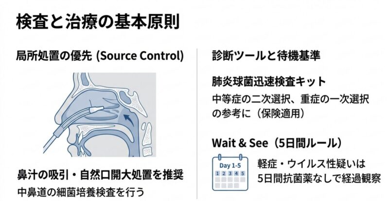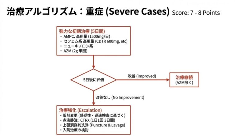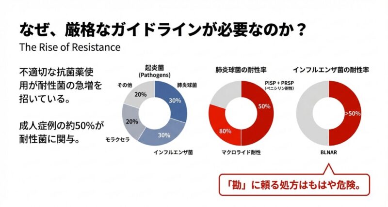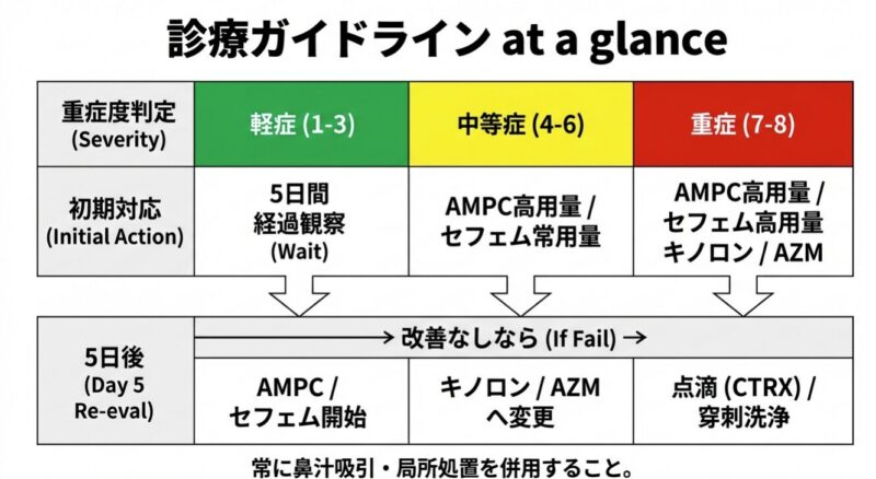 耐性菌の急増という深刻な課題に対処するために策定された、急性鼻副鼻腔炎の革新的な診療指針を解説しています。主な内容は、発症期間や痛み、鼻汁の状態に基づいた重症度判定スコアの導入と、それに応じた適正な抗菌薬選択のアルゴリズム提示に集約されます。特に、軽症例には安易に投薬せず「5日間の経過観察」を推奨する一方で、重症例にはアモキシシリンを中心とした効果的な薬物療法を段階的に適用する戦略を明確にしています。最終的には、微生物の進化に合わせた動的なツールとしてガイドラインを活用することで、将来にわたって薬の有効性を守るという薬剤耐性対策の重要性を強調しています。