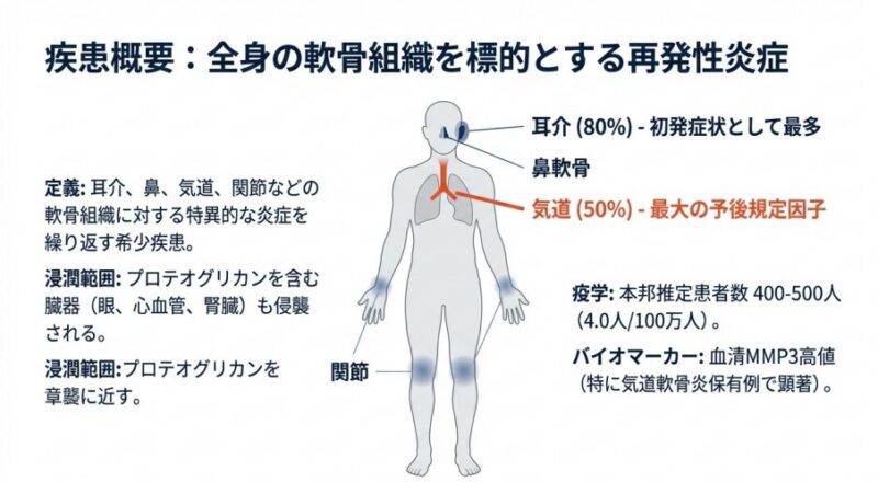 希少疾患である再発性多発軟骨炎(RP)に関する日本国内初の本格的な診断・治療ガイドラインの草案をまとめました。全身の軟骨に炎症が繰り返される本疾患の標準治療の確立と、医療従事者や患者間の相互理解を深めることが目的です。内容は、過去の疫学調査に基づいた臨床的特徴や重症度分類の解説から始まり、近年発見されたVEXAS症候群との関連性、さらには具体的な臨床疑問(CQ)に対するエビデンスレベルを伴う推奨事項まで網羅的に構成されていました。特に生命予後を左右する気道病変への早期介入や適切な薬物療法の重要性が強調されており、医療現場での迅速な意思決定を支援する実用的な指針となっています。そのまとめです。