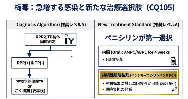 近年、国内では梅毒の急増が顕著であり、2021年に導入された持続性ペニシリン筋注製剤が治療の主軸となっています。梅毒はHIVとの重複感染も多いため同時検査が強く推奨され、診断後7日以内の全例届出が義務付けられています。