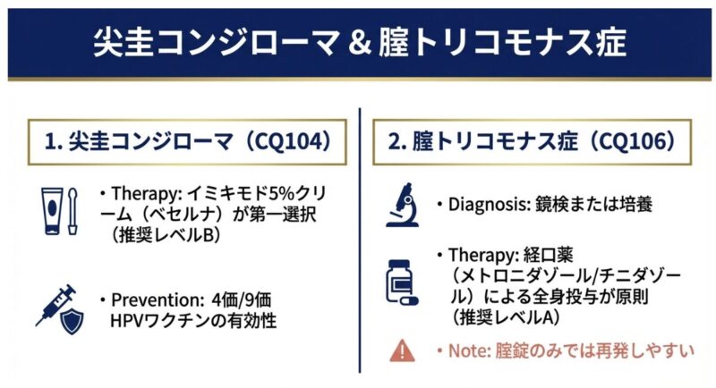 尖圭コンジローマでは、イミキモドクリーム等の外用薬に加え、「HPVワクチン(4価・9価)」による予防が最新戦略の要です。特に9価ワクチンは、原因となる6・11型に加え、子宮頸がんリスクの高い52・58型等もカバーし、約90%の予防効果が期待されています。