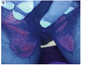 紅色陰癬=Corynebacterium属の皮膚感染。ウッドランプ(紫外線ライト)でサンゴの様に赤色に輝く(細菌によって生成されるポルフィリンに紫外線が当たると赤く光る)ことが特徴。足趾間感染が最も多く、鼠径部にも見られる。白癬と鑑別を要する。治療自体はクラリスロマイシンなどの抗生剤を内服することで治癒できる。クリンダマイシンやムピロシンなどの薬剤を患部に直接塗布することも有効。