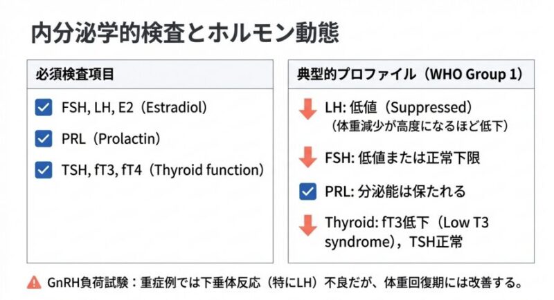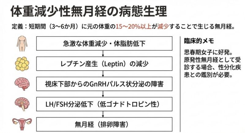体重減少性無月経は、短期間(3〜6か月以内)に元の体重の15〜20%以上を失うことで、視床下部からのGnRH(ゴナドトロピン放出ホルモン)分泌が障害され引き起こされます。これには摂食障害を伴う神経性やせ症と、過度なダイエットや運動によるものが含まれます。