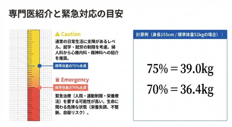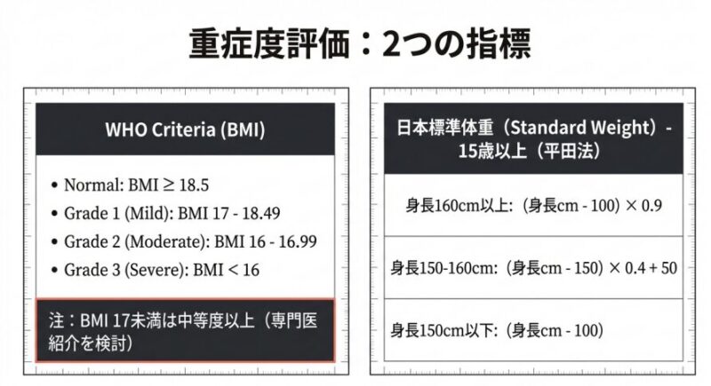 第一に重症度評価です。BMI 17未満や標準体重の75%未満は専門医への紹介を検討すべき段階であり、特に標準体重の70%未満では緊急治療を要する可能性があります。