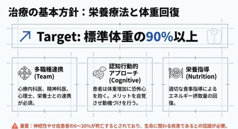 第二に体重回復の優先です。治療の原則は栄養改善と体重増加であり、標準体重の90%以上への回復を目標とします。