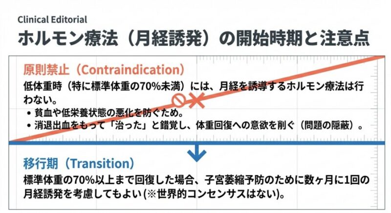 第三に不適切な月経誘導の回避です。低体重時(特に標準体重の70%未満)は、体力の消耗を防ぐため原則としてホルモン療法による月経誘導は行いません。