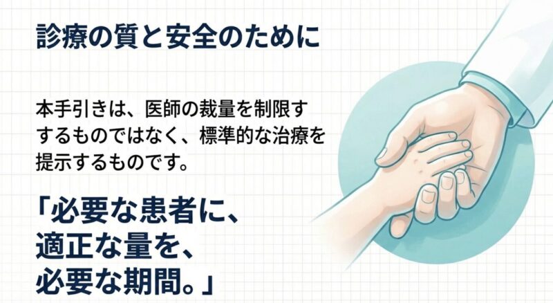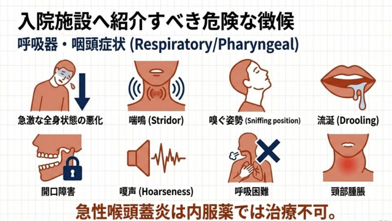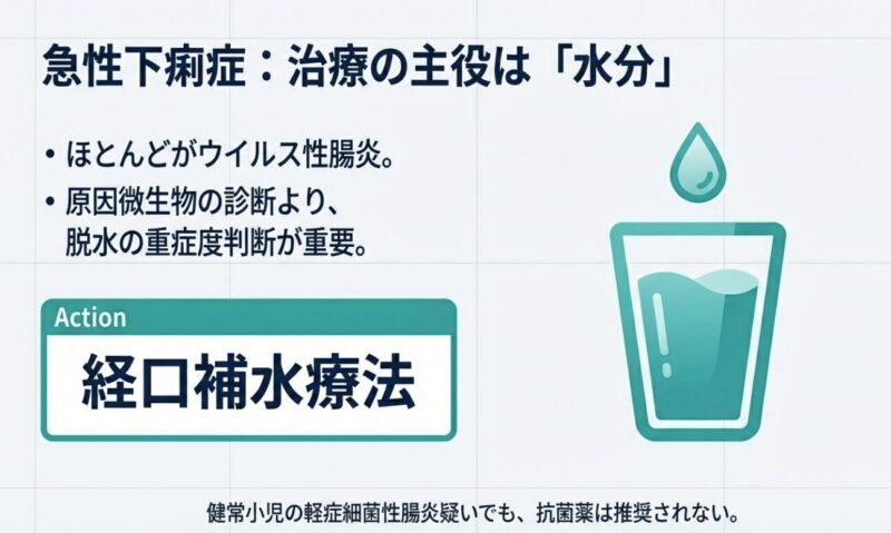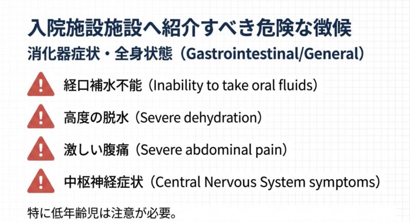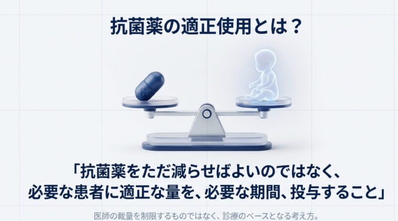 また、診療に際しては「Red Flag(危険な徴候)」への注意が不可欠です。急激な全身状態の悪化、呼吸困難、経口補水不能、高度の脱水などが認められる場合は、速やかに入院施設へ紹介する必要があります。抗菌薬の適正使用とは、単に薬を減らすことではなく、「必要な患者に適正な量を必要な期間、投与すること」と定義されています。