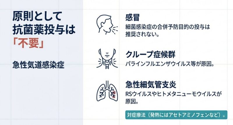 感冒やクループ症候群、急性細気管支炎などのウイルス性疾患に対しては、細菌感染症の合併予防を目的とした抗菌薬投与は推奨されないことを基本原則としています。急性下痢症も多くがウイルス起因であり、抗菌薬よりも脱水の評価と経口補水療法が優先されます。