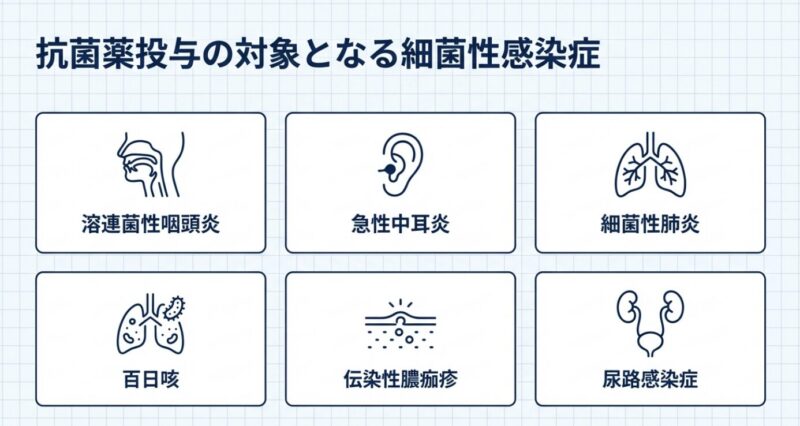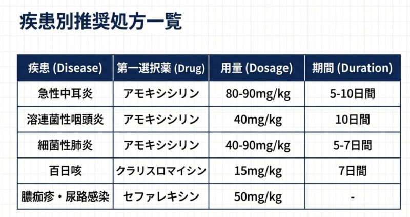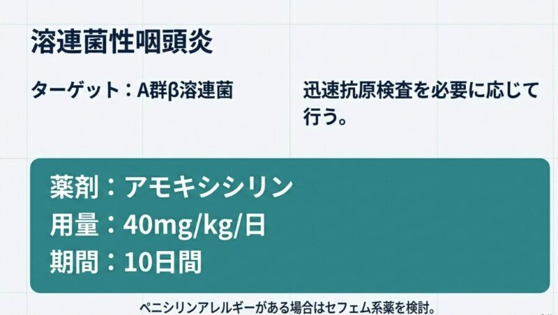 • 溶連菌性咽頭炎・急性中耳炎・細菌性肺炎:原則としてアモキシシリン(ペニシリン系)を使用します。