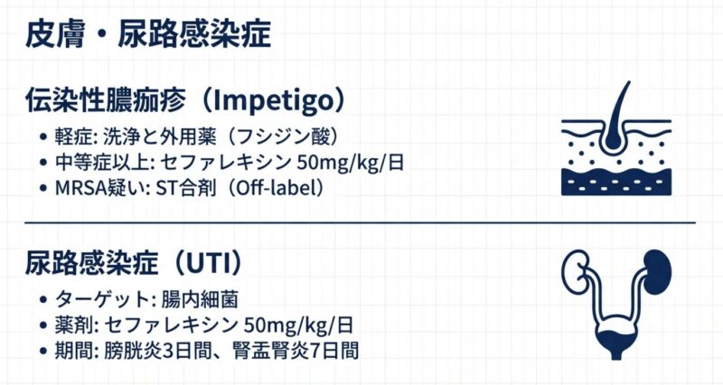 • 伝染性膿痂疹・尿路感染症:セファレキシン(第1世代セフェム系)が推奨されます。