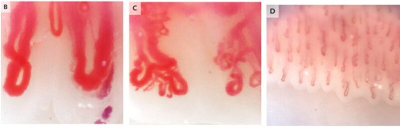 爪甲毛細検査では根尖直径が50µm程度(通常<15µm)の拡張した毛細血管(B)や枝分かれした新生血管形成毛細血管ループ形成が確認された(C)。ちなみに毛細血管強検査の通常像がD。