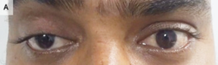 眼瞼下垂を認める右眼瞼を手動で持ち上げると、左眼瞼が垂れ下がる症状を認めた。