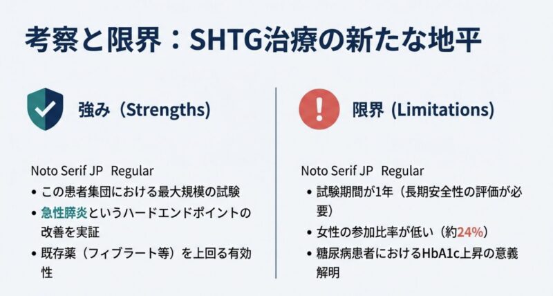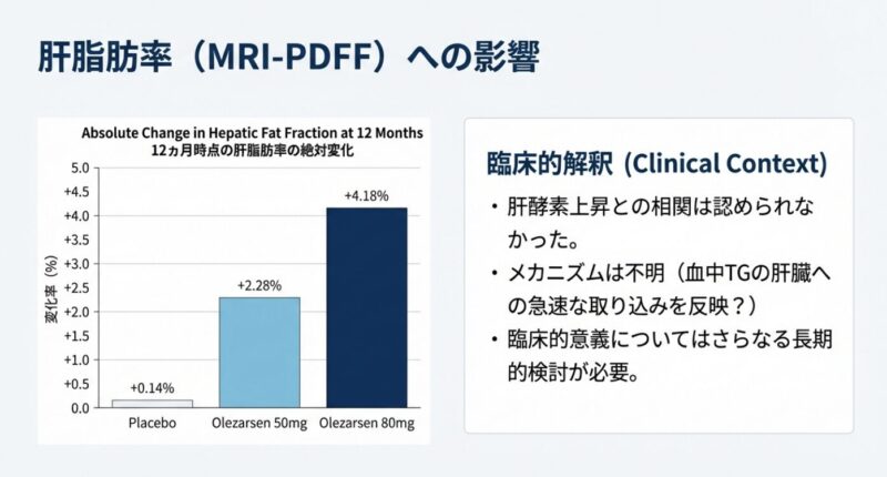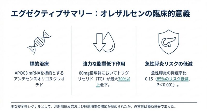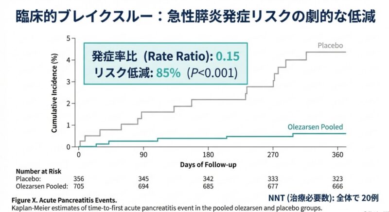 命に関わる急性膵炎のリスクを高める重症高トリグリセリド血症に対する新薬オレザルセン(olezarsen)の有効性と安全性を検証した第3相臨床試験です。脂質代謝を阻害するアポリポタンパク質C-IIIを標的とし、血中の中性脂肪値を劇的に減少させ、膵炎の発症率を有意に低下させることが示されました。一方で、高用量の投与では肝脂肪の増加血小板減少といった副作用が一部で見られたものの、全体的な安全性はプラセボと比較して良好であると結論付けられています。結論として、既存の治療法では効果が不十分だった重症患者に対し、オレザルセンが極めて効果的な治療選択肢となる可能性が提示されています。