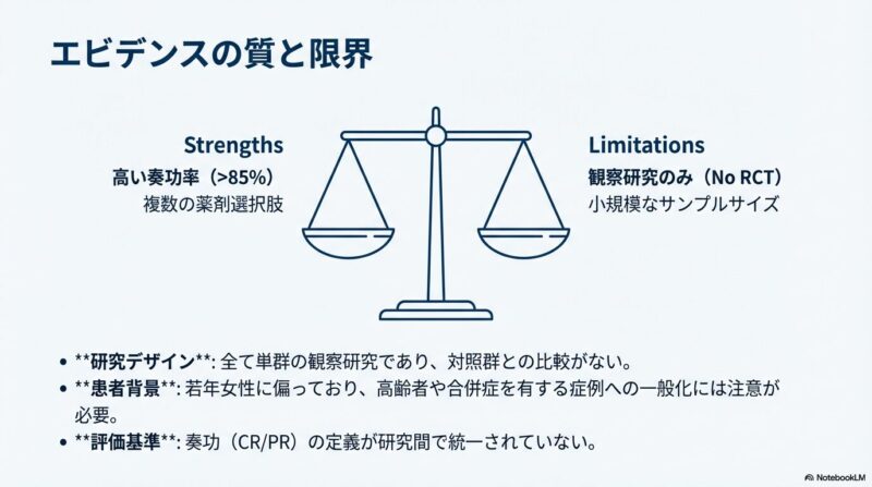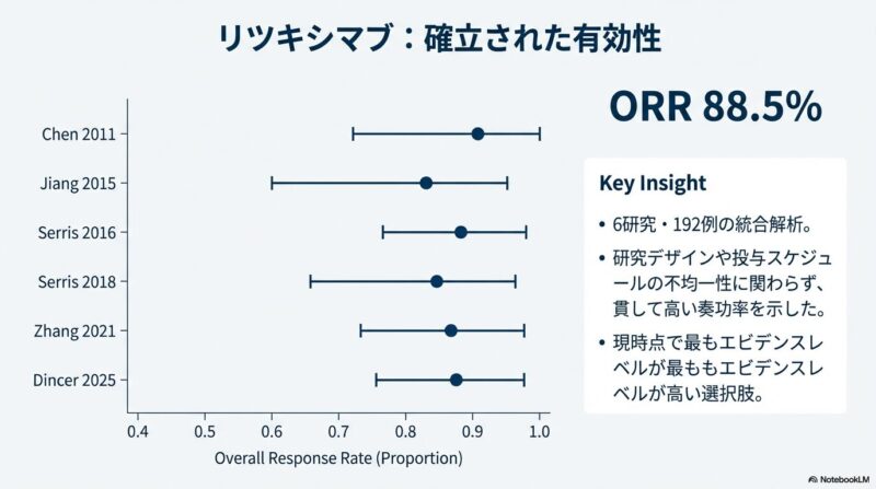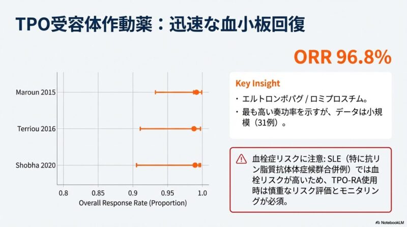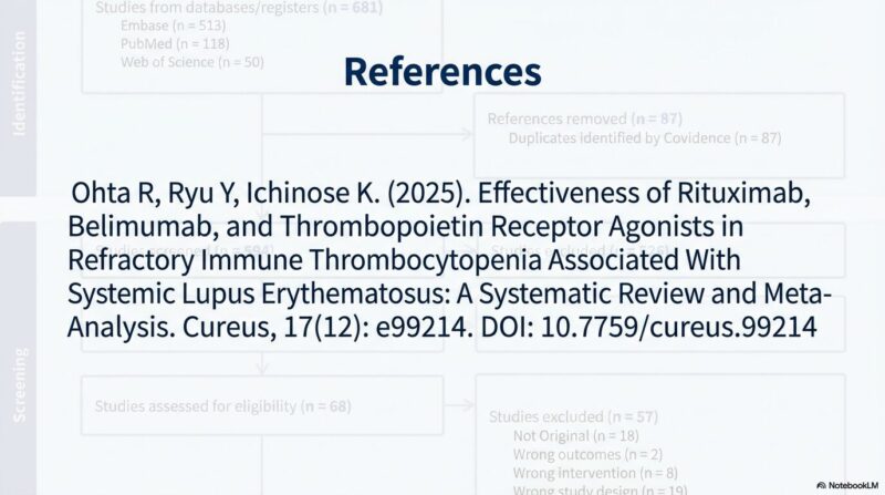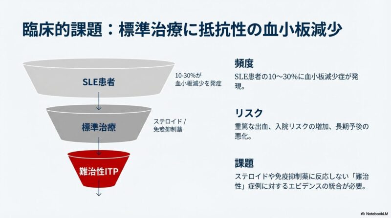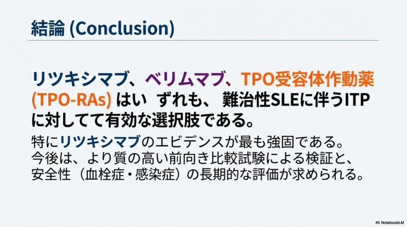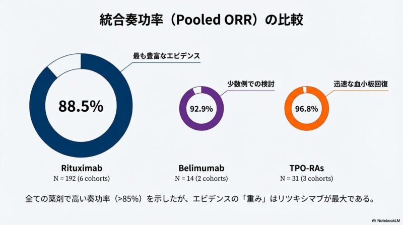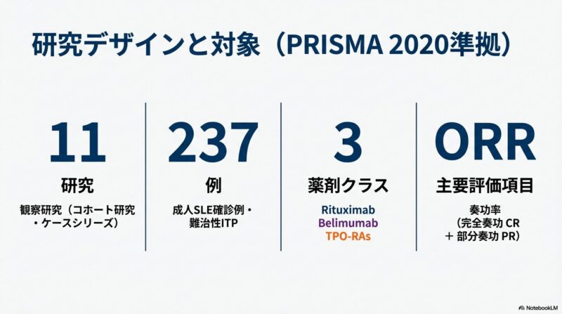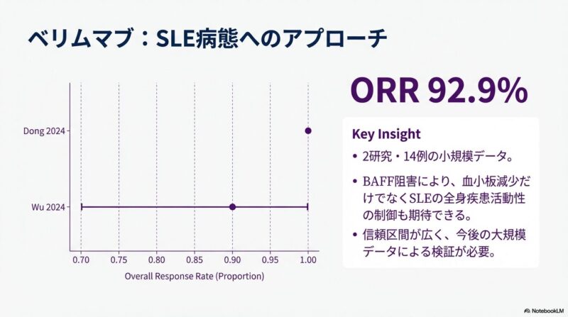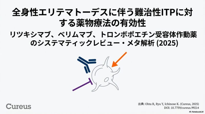 既存の治療法が効かない難治性の全身性エリテマトーデス(SLE)に伴う免疫性血小板減少症に対し、比較的新しい3つの治療薬がどの程度有効であるかを検証した系統的レビューおよびメタ解析を共有しておきます。B細胞を標的とするリツキシマブやベリムマブ、および血小板産生を促すトロンボポエチン受容体作動薬(TPO-RA)に関する複数の臨床データを統合し、その治療効果の包括的レビューです。解析の結果として、これらすべての薬剤において80〜90%を超える高い奏効率が示され、標準治療で改善が見られない深刻な症例に対する強力な選択肢となり得ることが明らかになりました。症例数の少なさや観察研究主体という限界を認めつつも、複雑な病態を持つSLE患者の血液学的異常を管理するための重要なエビデンスに基づき、臨床判断の支援となれば幸いです。