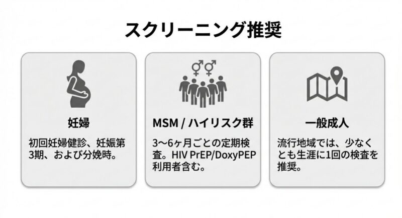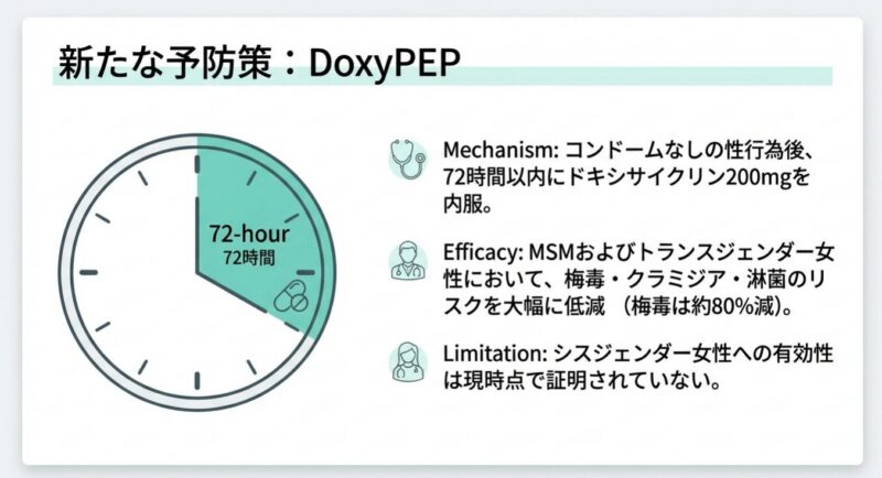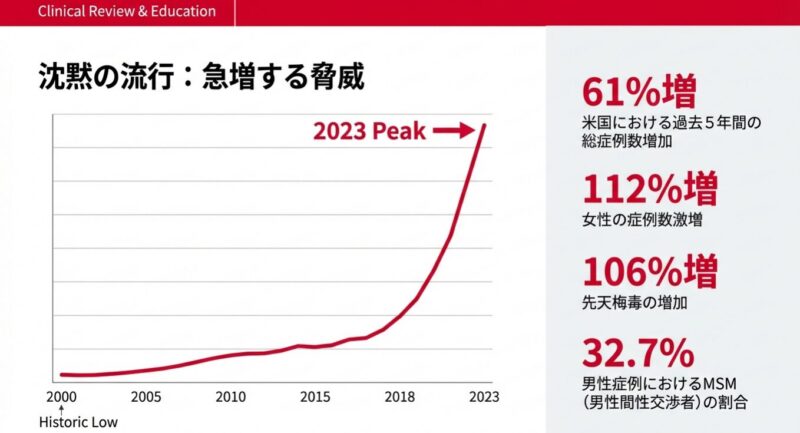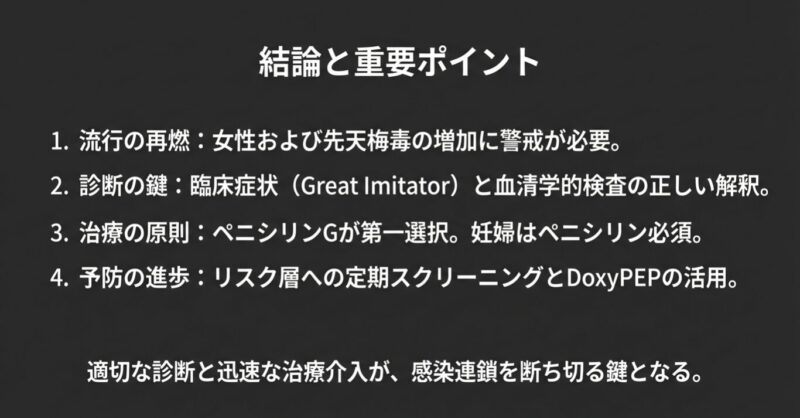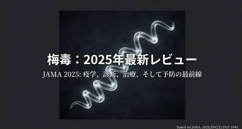 梅毒の疫学、診断、治療、および予防に関する最新の知見をまとめた包括的な臨床レビューです。世界的に感染者が急増する中、特に米国を中心に日本でも先天性梅毒や特定の集団での罹患率上昇という深刻な現状が起きています。診断面では2段階の血清学的検査の重要性を説き、治療においてはペニシリンGが依然として第一選択薬であることを強調しています。また、感染リスクを大幅に低減させる新たな予防策として「ドキシサイクリン曝露後予防(doxyPEP)」の効果と指針についても詳述しました。病期ごとの臨床症状から最新のスクリーニング基準までを網羅し、医療従事者への実践的なガイドになると思います。