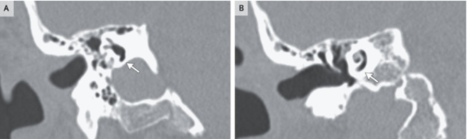 頭部CT画像では後頭部骨折と耳嚢(内耳構造を取り囲む骨)を通じた右側頭部骨折が明らかになり、その結果、迷路内(A)および蝸牛内(B)の空気の異常が生じていた。