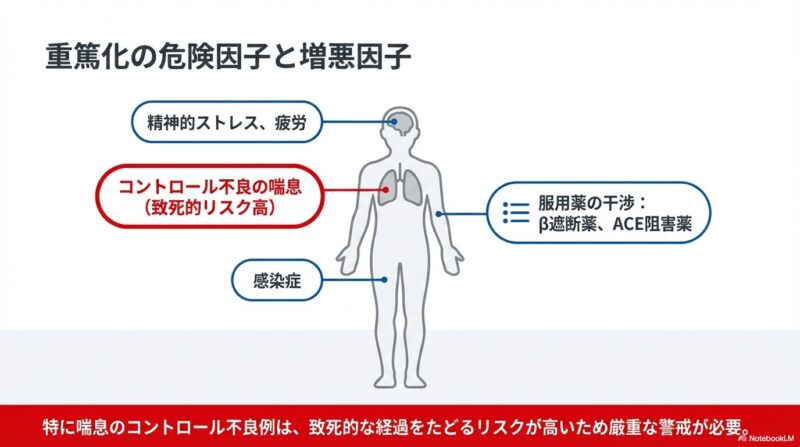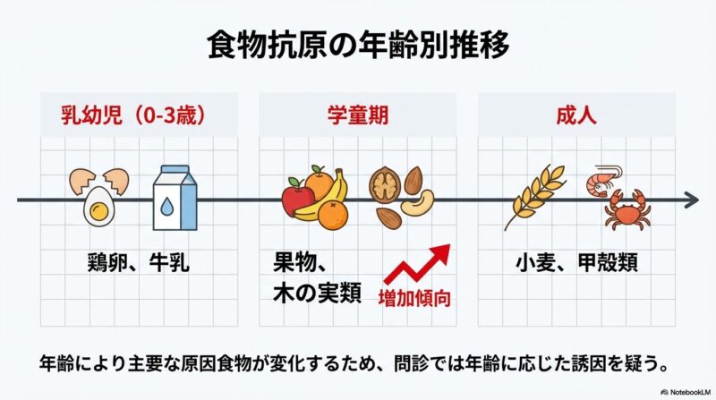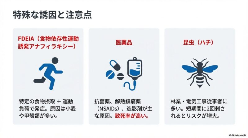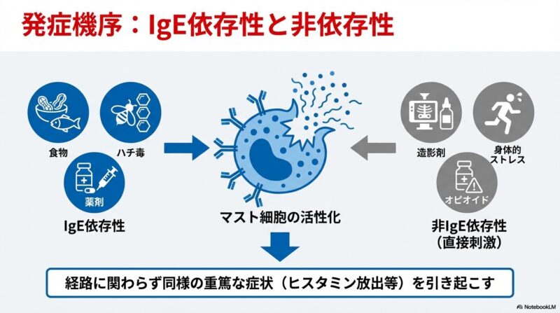 誘因は多岐にわたりますが、日本では食物(鶏卵、牛乳、小麦など)、医薬品(造影剤、抗生物質など)、昆虫(ハチ)が多く報告されています。特に喘息の合併やアドレナリンの使用遅延は、死亡リスクを高める危険因子です。症状は皮膚・粘膜症状が80〜90%の患者に現れるほか、呼吸器や循環器など複数の臓器に及ぶのが特徴です。