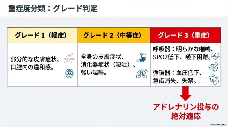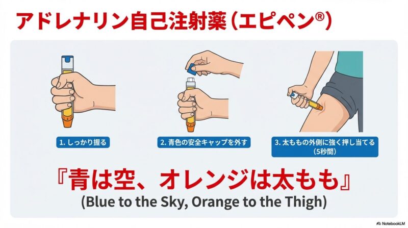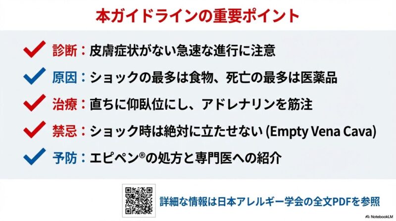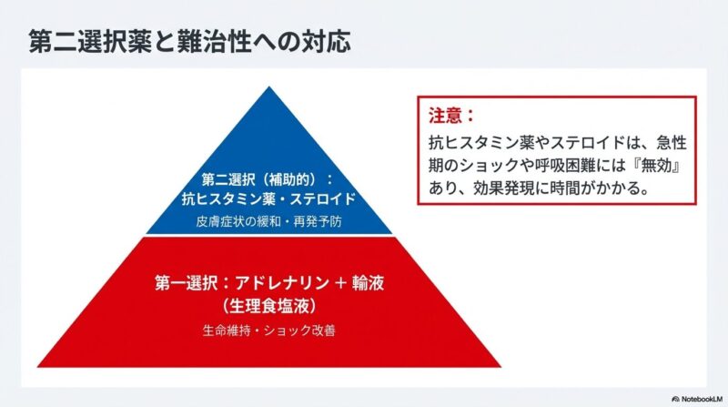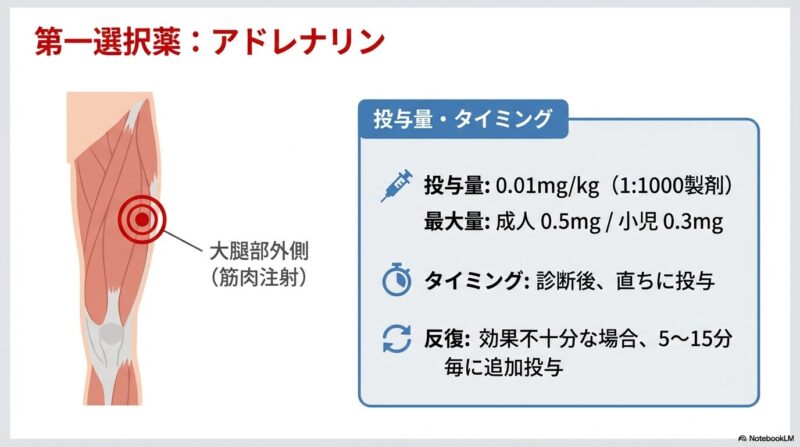 治療において最も重要なのは、アドレナリンの早期筋肉注射です。第一選択薬として、速やかに大腿前外側部に投与することが推奨されており、体位は原則として仰臥位を維持します。抗ヒスタミン薬やグルココルチコイドはあくまで第二選択薬であり、救命のためのアドレナリンの代わりにはなりません。