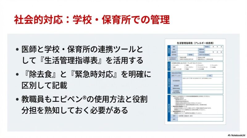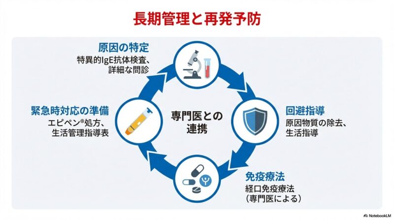 再発防止と長期管理のためには、原因の特定と回避に加え、アドレナリン自己注射薬(エピペン)の処方と適切な使い方の指導が不可欠です。また、学校や保育所などの社会的な場では、アレルギー疾患生活管理指導表の活用や緊急時の役割分担をあらかじめ決めておくなど、組織的な対応が重要です。