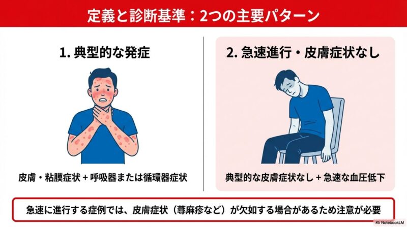 アナフィラキシーは、急速に発症し死に至ることもある重篤な全身性の過敏反応です。主な診断基準は、皮膚・粘膜症状に加え、呼吸器、循環器、または重度の消化器症状を伴う場合や、既知のアレルゲン曝露後の急激な血圧低下などが挙げられます。