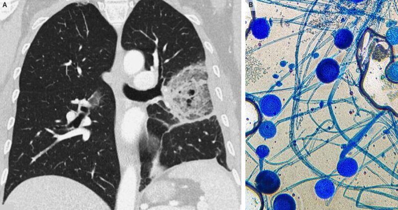 胸部CTでは、密な硬化リングに囲まれたすりガラス状の不透明な領域が示された。これは逆ハローサインとして知られている。気管支肺胞洗浄が施行され、ラクトフェノールコットンブルー染色(糸状菌の形態の観察に優れる染色法)にて糸状菌であることが同定され(B)、培養結果からムコール感染であることが同定された。