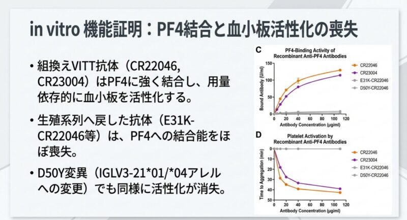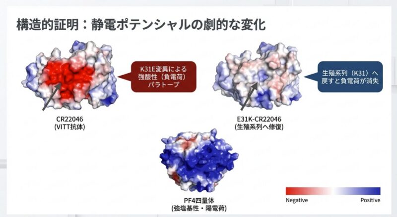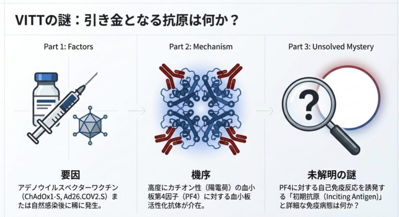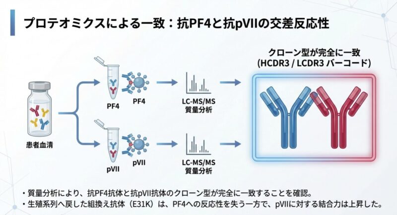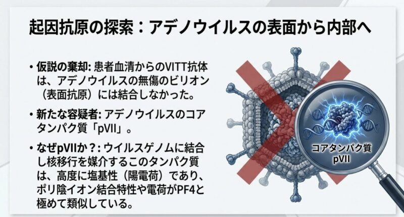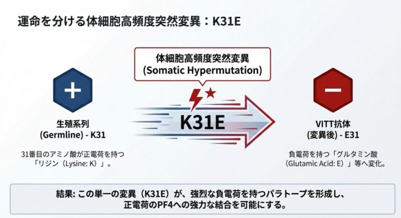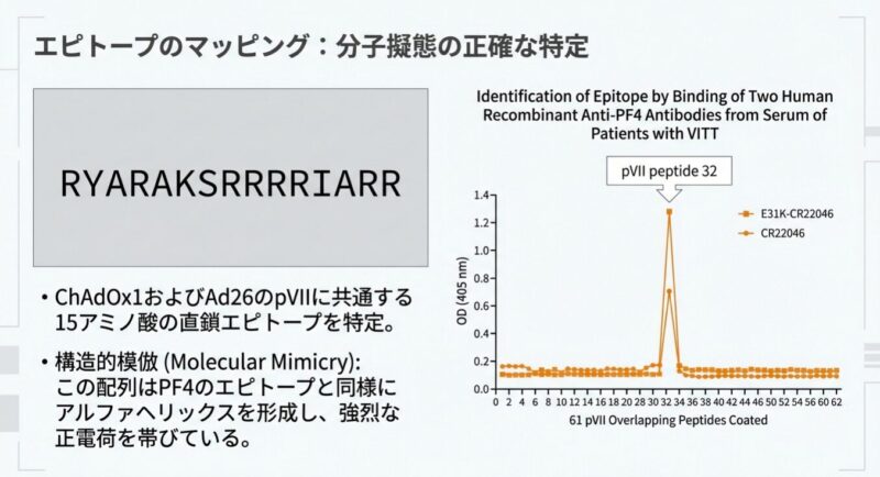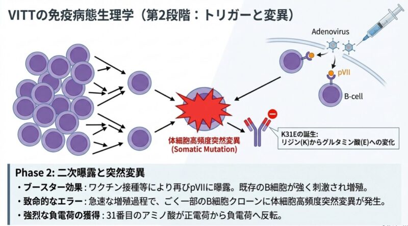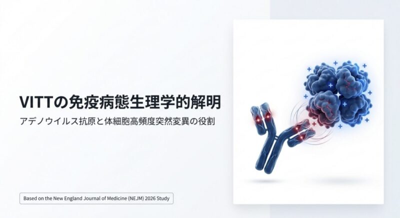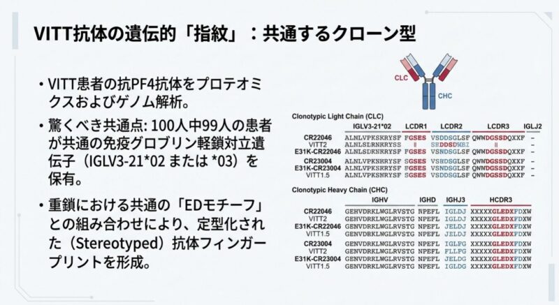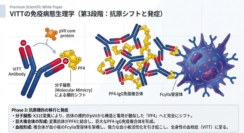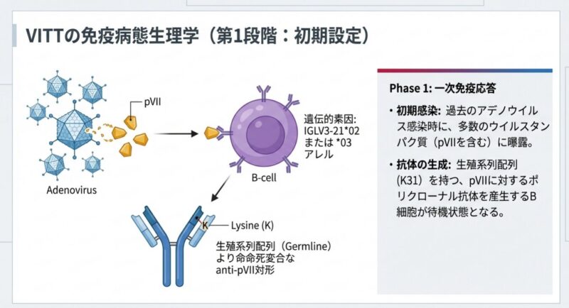 発症の鍵は、アデノウイルスのコアタンパク質「pVII」とヒトの血小板第4因子(PF4)の間の「分子模倣」にあります。pVIIは電荷や結合特性がPF4と酷似しており、特定の遺伝的背景(IGLV3-2102または03アレル)を持つ人の免疫系がpVIIに反応する過程で、特定の「体細胞突然変異(K31E)」が生じます。この変異により、抗体の標的がpVIIからPF4へと劇的にシフトし、血小板を異常に活性化させて血栓を引き起こす病原性の「VITT抗体」へと変化するのです。