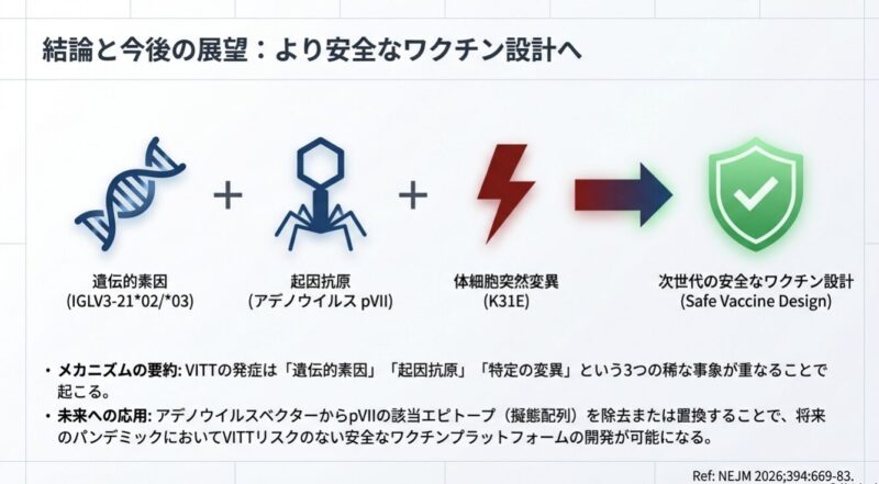 この知見は、VITTがなぜ接種から5日以降という短期間で急速に発症するのか、またなぜ極めて稀なのかを分子レベルで説明するものです。また、pVIIの構造を改変することで、将来的に副作用リスクを抑えたより安全な次世代ワクチンの設計が可能になると期待されています。