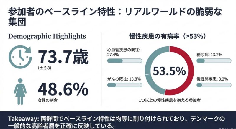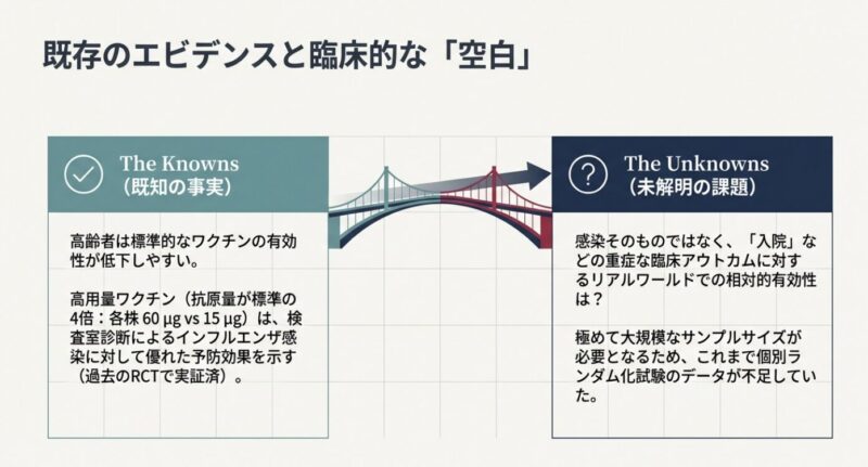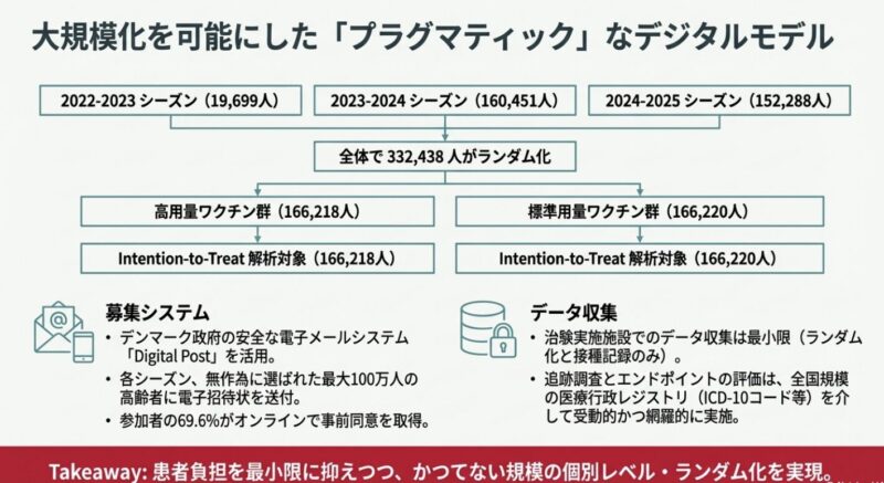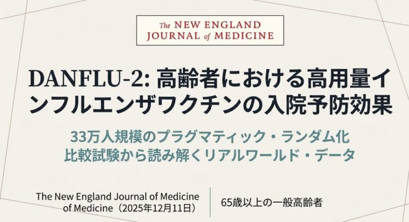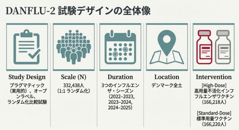 DANFLU-2試験は、65歳以上の高齢者を対象に、高用量インフルエンザワクチンの有効性を標準用量と比較検証した大規模なランダム化比較試験です。高用量ワクチンは、標準用量の4倍の抗原量(各株60μg)を含んでいます。