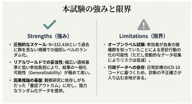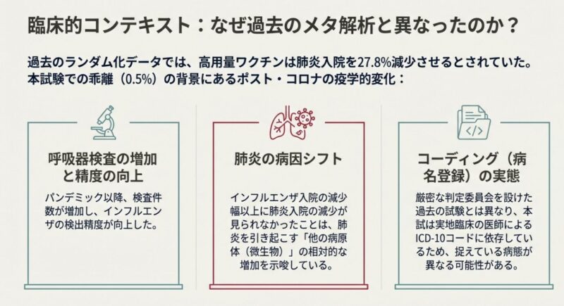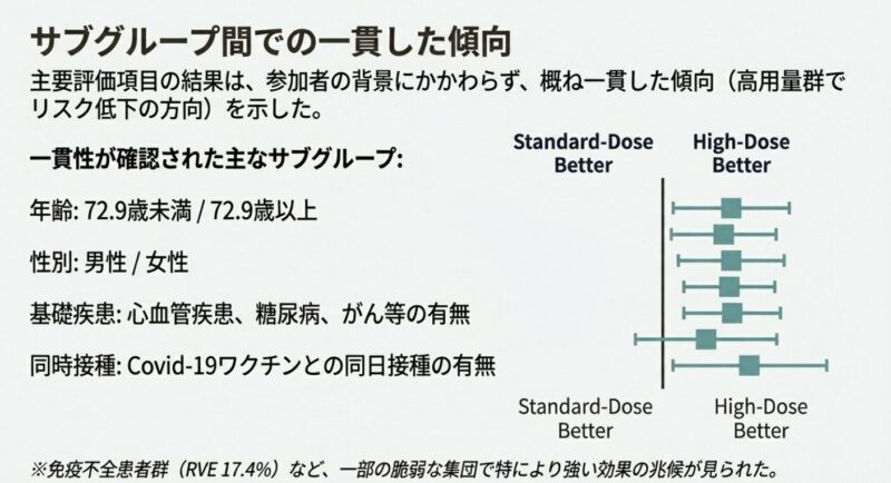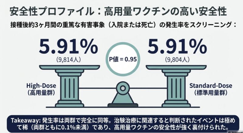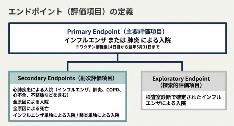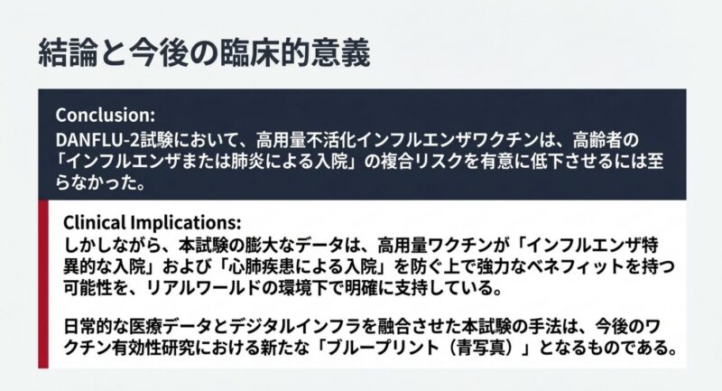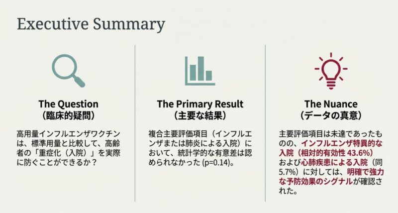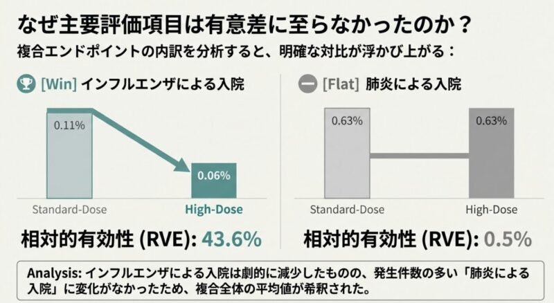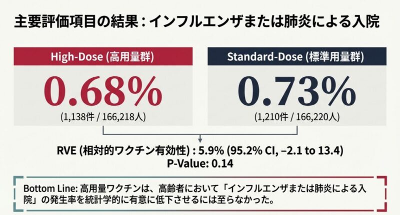 結論として、肺炎を含む複合的な入院抑制において有意差は得られなかったものの、インフルエンザ特有の入院や心肺疾患の予防においては、高用量ワクチンの臨床的利益が示唆されました。