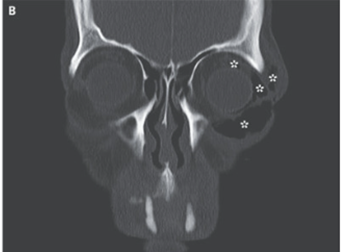 外傷性眼窩気腫症とは眼窩骨折により、副鼻腔から眼窩内に空気が通過できるようになった場合に生じる。