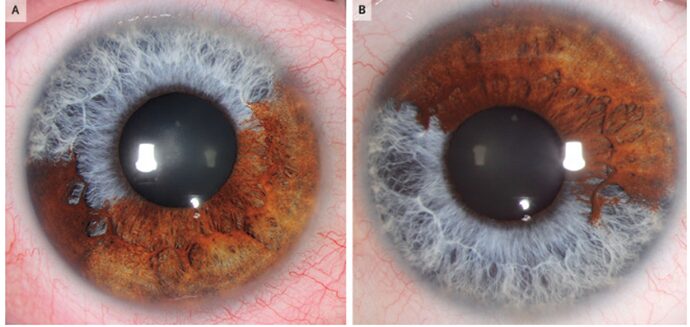 右眼の虹彩は青色の上部と茶色の下部からなり(A)、左眼は茶色の上部と青色の下部からなっていた(B)