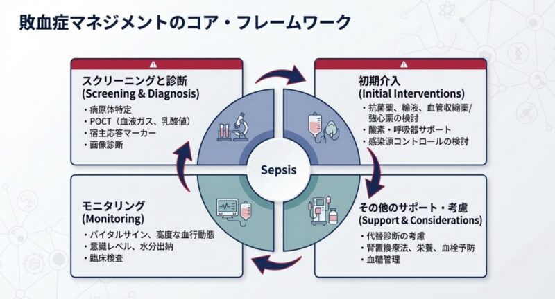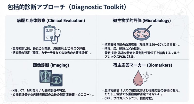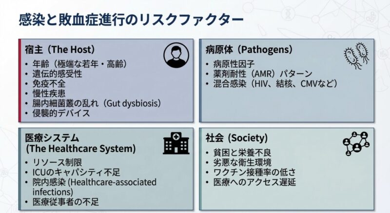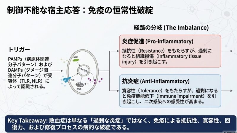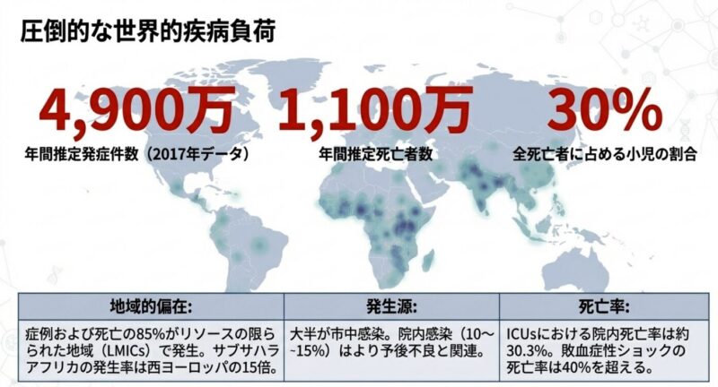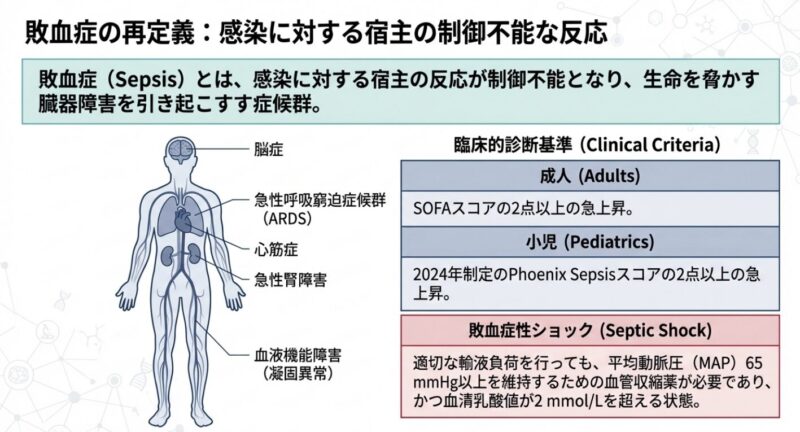 敗血症という命に関わる病態を多角的に解説しています。敗血症は、感染に対する生体反応の調節不全が引き起こす致命的な臓器不全と定義され、病原体の特性から患者の遺伝的要因、さらには社会経済的な環境までがその発症と予後に深く関与しています。診断の難しさを浮き彫りにする最新の臨床定義から始まり、免疫系や代謝系が連鎖的に崩壊していく精緻な病態生理学、そして迅速な抗菌薬投与や循環動員を柱とする管理戦略へと展開しています。特に、画一的な治療の限界を指摘し、患者固有の生物学的シグネチャーに基づいた個別化医療の重要性を説いています。最終的には、生存者の長期的な生活の質や人工知能(AI)を活用した早期発見など、次世代の治療展望を示し、世界の医療格差を是正し、すべての人に適切な救命手段を届けるという崇高な目的が掲げられています。