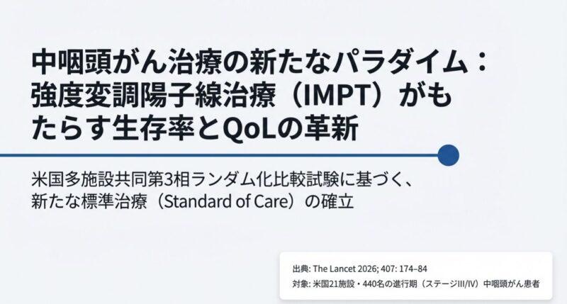 中咽頭癌の放射線治療において、最新の陽子線治療(IMPT)が、従来の標準治療である強度変調放射線治療(IMRT)と比較して、高い有効性と副作用の軽減を両立することが第3相国際共同治験で証明されました。