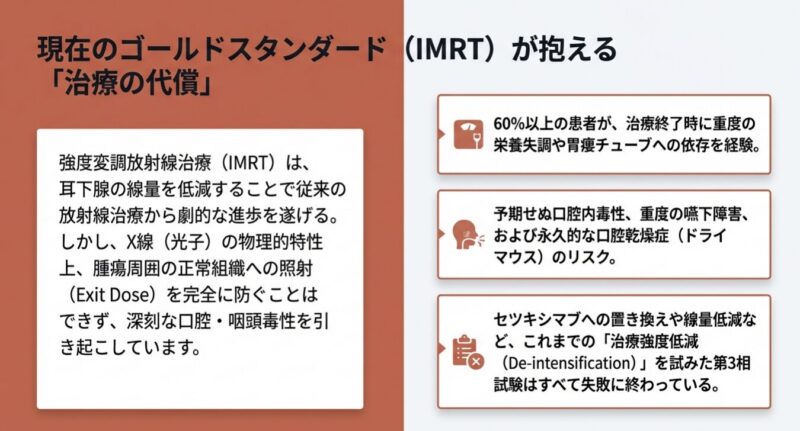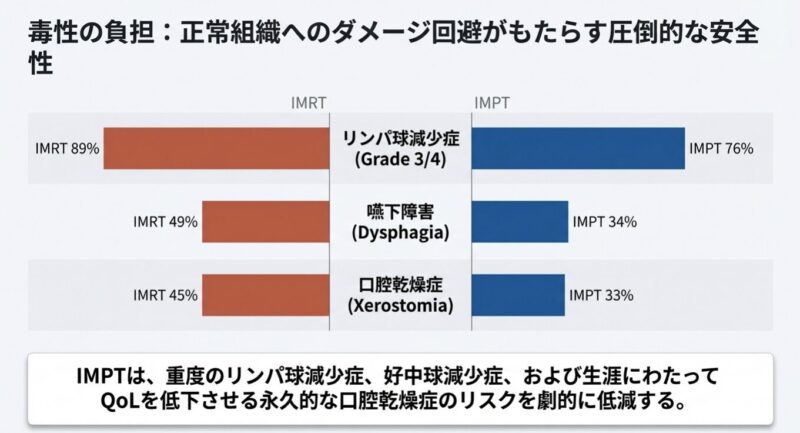 特筆すべきは、深刻な副作用(毒性)口腔乾燥(ドライマウス)、嚥下障害のリスクを有意に低減した点です。特に、治療後の生活の質に直結する胃瘻(経管栄養チューブ)への依存率は、IMRTの40.2%に対し、陽子線群では26.8%まで抑えられました。