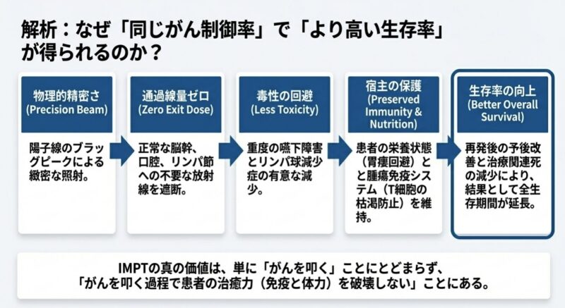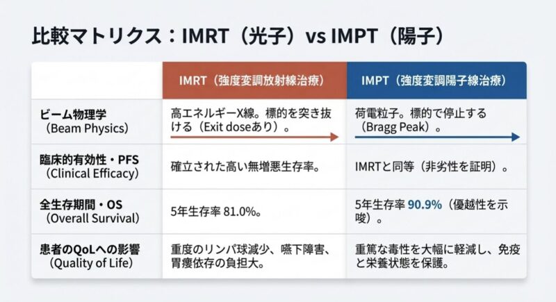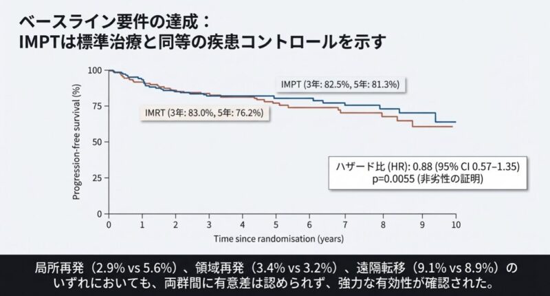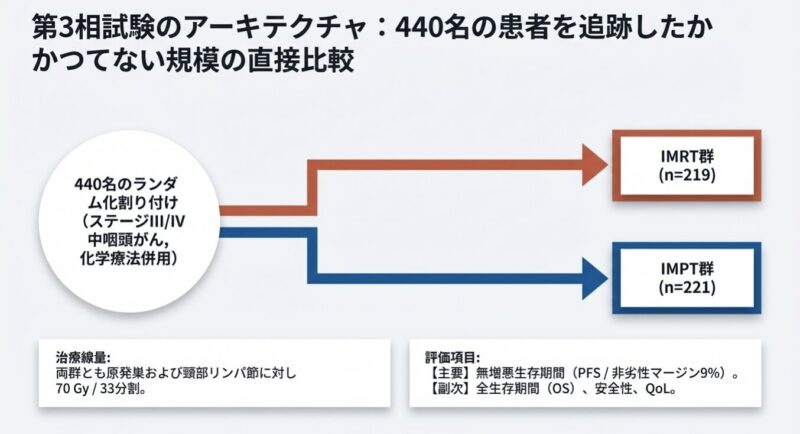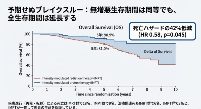 この試験は、ステージIII〜IVの中咽頭がん患者440名を対象とした世界初の直接比較研究です。主要評価項目である無増悪生存率(PFS)非劣性(同等以上の効果)が示されました。さらに、5年全生存率ではIMRTの81.0%に対し、陽子線群では90.9%と有意な改善が認められています。