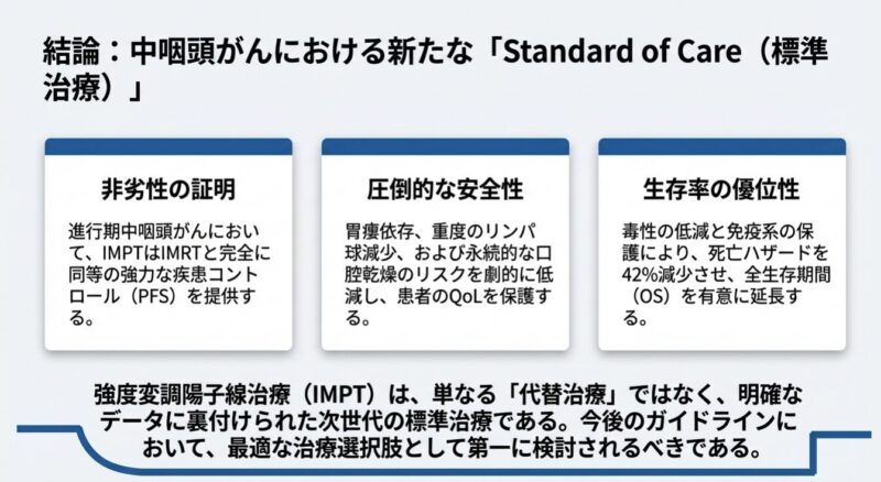 この結果により、陽子線治療は中咽頭癌における新たな標準治療(Standard of Care)となる可能性が示されました。
