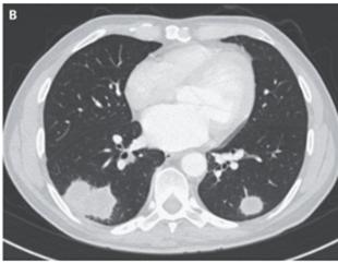 胸部CTでは肺結節が示唆された。