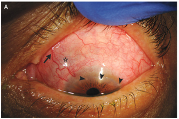 眼検査では、拡張した炎症を起こした強膜血管が明らかであった(→)。また強膜が薄くなり、青みがかった暴動膜組織(*)および周辺角膜浸潤(▼)