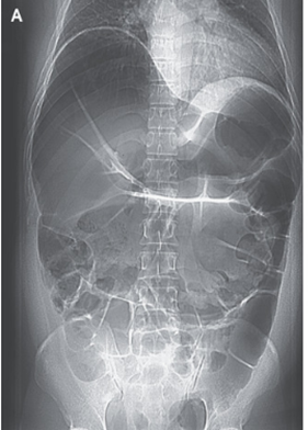 腹部X-pでは大腸の拡張が目立ち、小腸のループ形成も認めた。